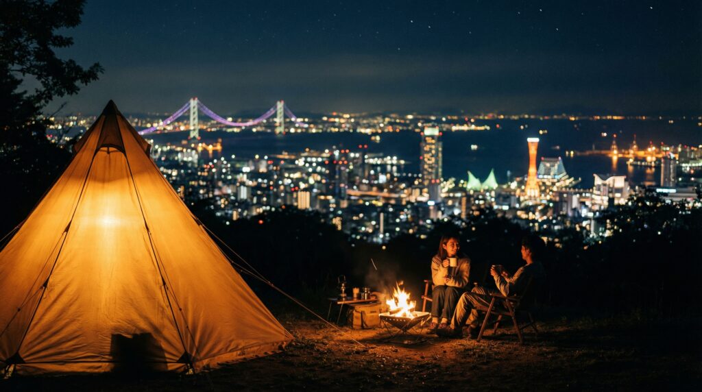 六甲山の上にあるため、神戸の市街地よりも気温が低く、夏場の避暑キャンプにも最適。 そして何より、少し歩けば「日本三大夜景」の一つである摩耶山掬星台(きくせいだい)からの夜景を楽しめます。 神戸の1000万ドルの夜景を見た後に、静かな森で焚き火をする。そんな都会的なキャンプスタイルが叶うのは、神戸ならではの特権です。