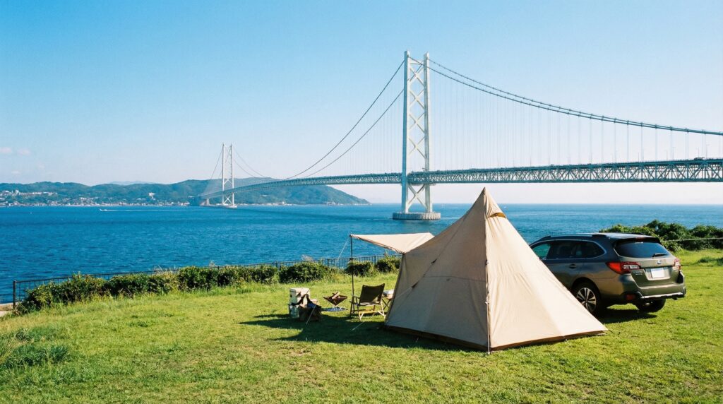 白い砂浜が広がり、波音を聞きながらコーヒーを淹れて飲むだけでも心が洗われます。 電車でのアクセスも比較的良く(山陽電鉄「林崎松江海岸駅」から徒歩約10分)、バックパック一つでふらりと訪れる「徒歩ソロキャンパー」にも優しい立地。 夕暮れ時には、明石海峡大橋がライトアップされ、幻想的な夜景へと移り変わる時間をゆっくりと楽しめます。