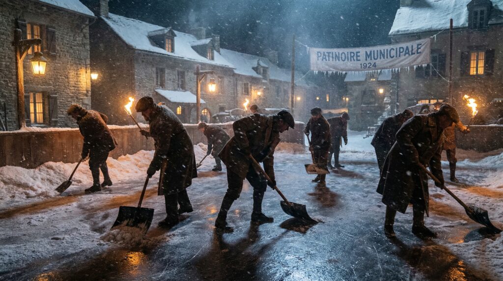 1923年の年末、シャモニーには記録的な大雪が降り、準備していたリンクが埋まってしまいました。600人以上の作業員が昼夜を徹して雪かきを行い、なんとか復旧させた矢先、今度は急激な気温上昇と雨が襲います。