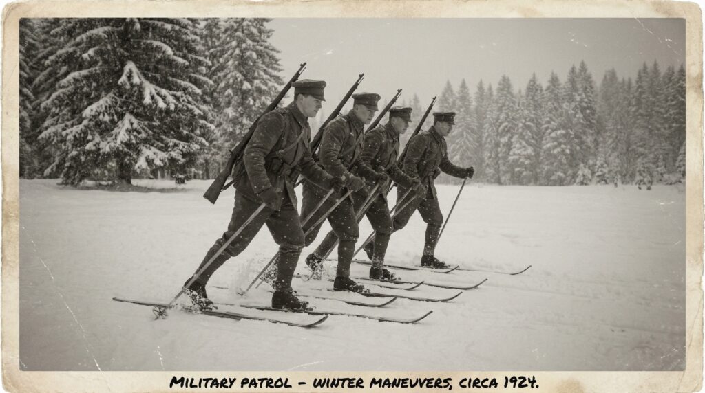 正式競技として行われた「ミリタリーパトロール」。これは現在の「バイアスロン」の前身となる競技です。軍服を着た4人の選手がチームを組み、スキーで走りながら射撃を行うものでした。当時はまだスポーツというより「軍事教練」の色合いが濃かったことがわかります。